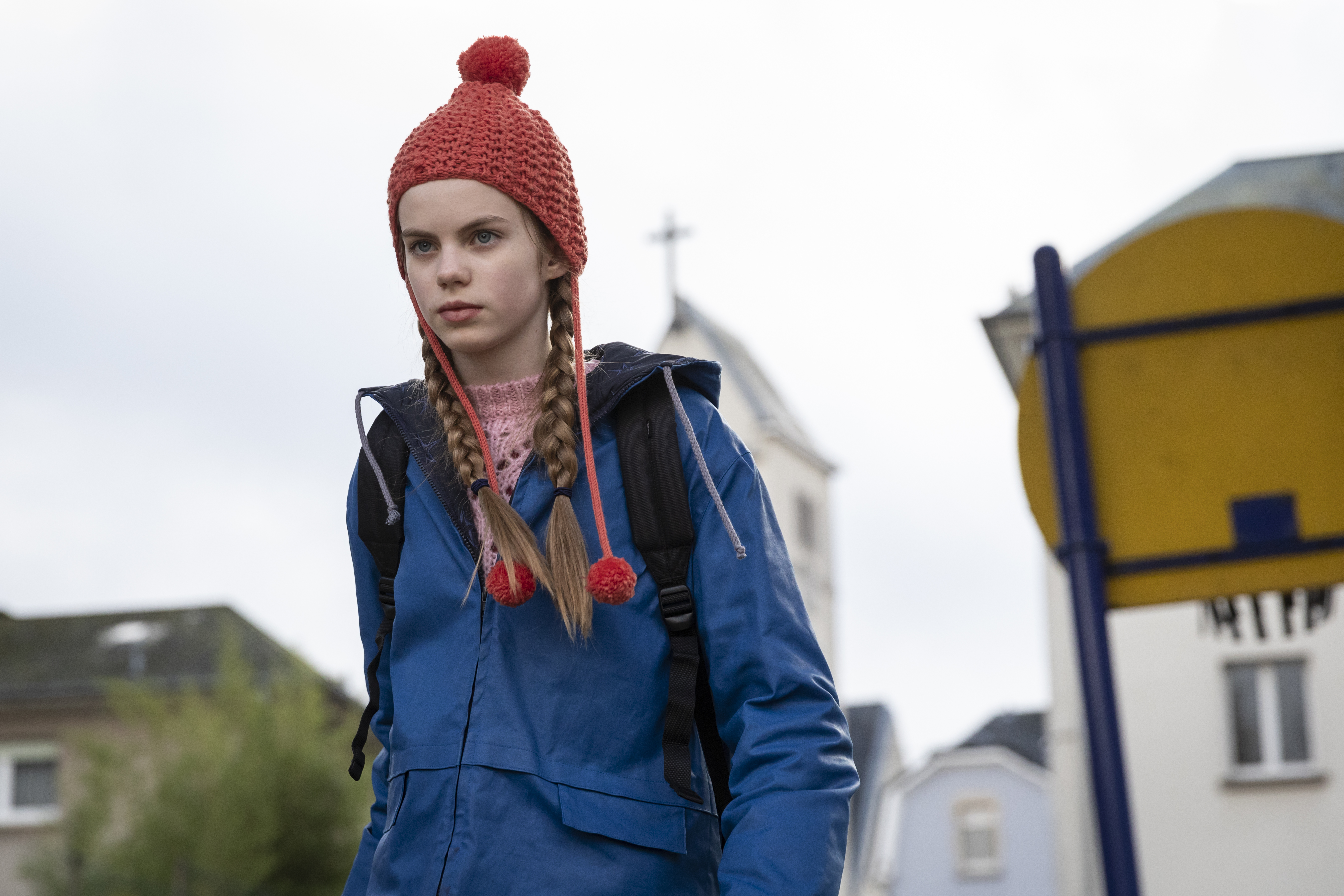 Ulja läuft mit blauer Regenjacke und roter Mütze durch die Straßen.