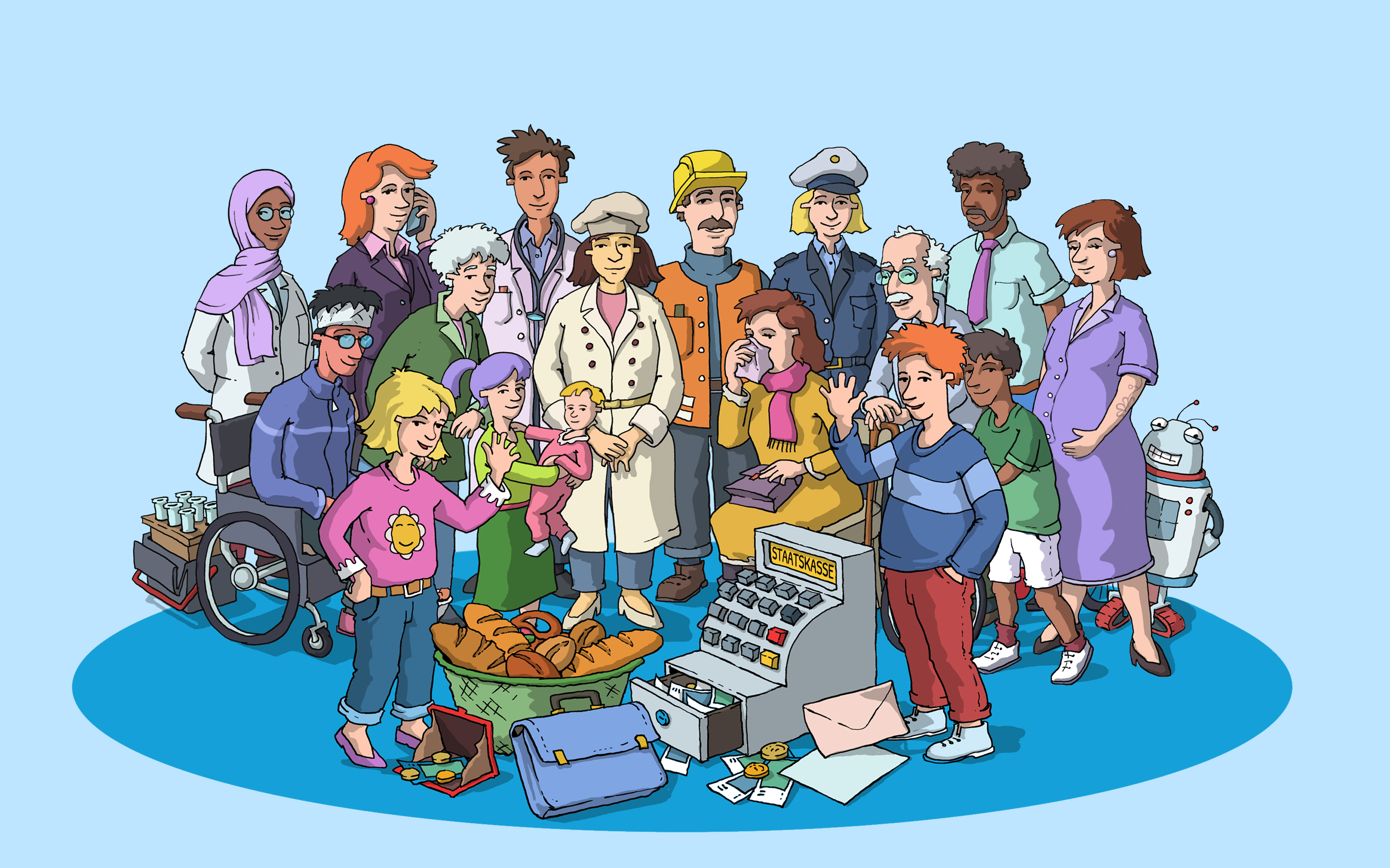 Anhand dieses Impulses werden Fragen nach Solidarität, Gerechtigkeit und Zusammenhalt aufgeworfen. Komplexe Begriffe wie Generationengerechtigkeit oder soziale Gerechtigkeit können anhand der Illustration veranschaulicht besprochen werden und als Einstieg in ein Thema dienen. Die Illustration ermöglicht einen Perspektivwechsel, der einen Blick für Gemeinschaft und die verschiedenen Notwendigkeiten eröffnet. Was bedeutet es, wenn ein Staat ‚sozial‘ ist? Warum ist es wichtig, dass Menschen etwas aus der gemeinsamen Kasse bekommen? Die Lernenden können verschiedene Bedeutungen der grafischen Darstellung entdecken, eigene Sichtweisen äußern und darüber ins Gespräch kommen.