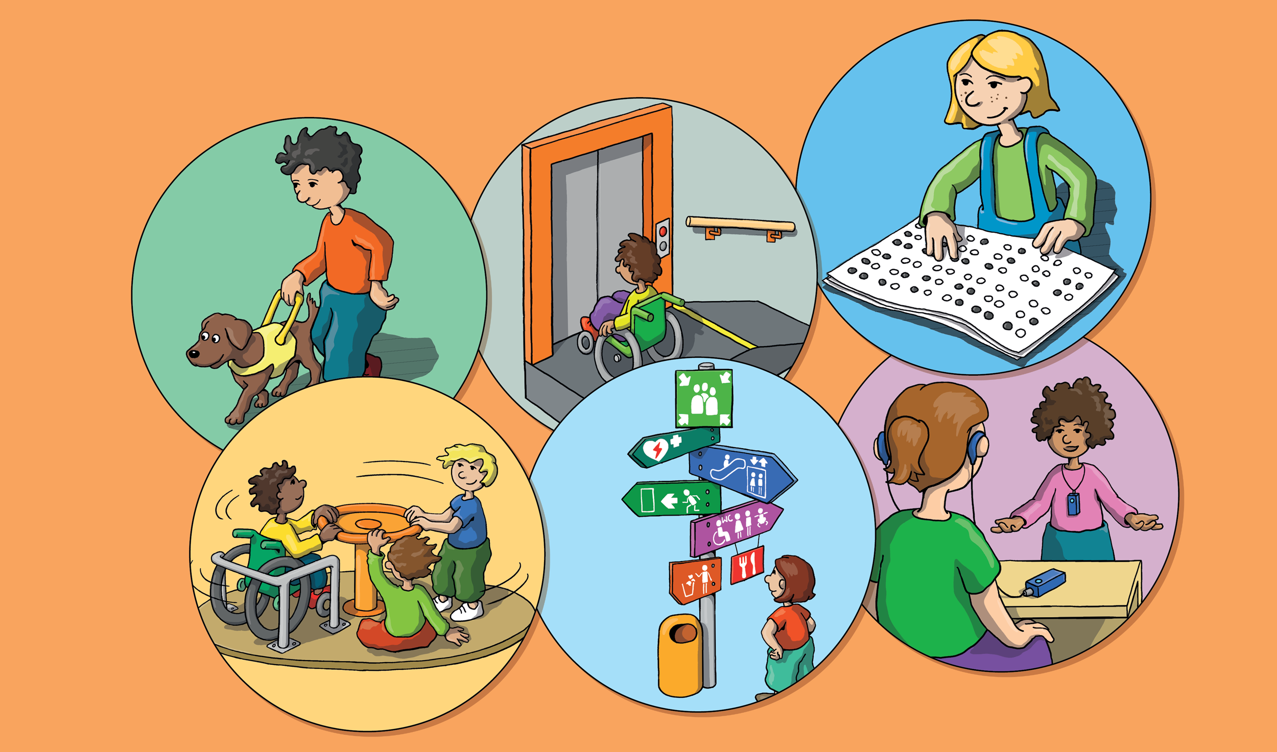 Kinder mit Blindenhund, lesen Blindenschrift, im Rollstuhl