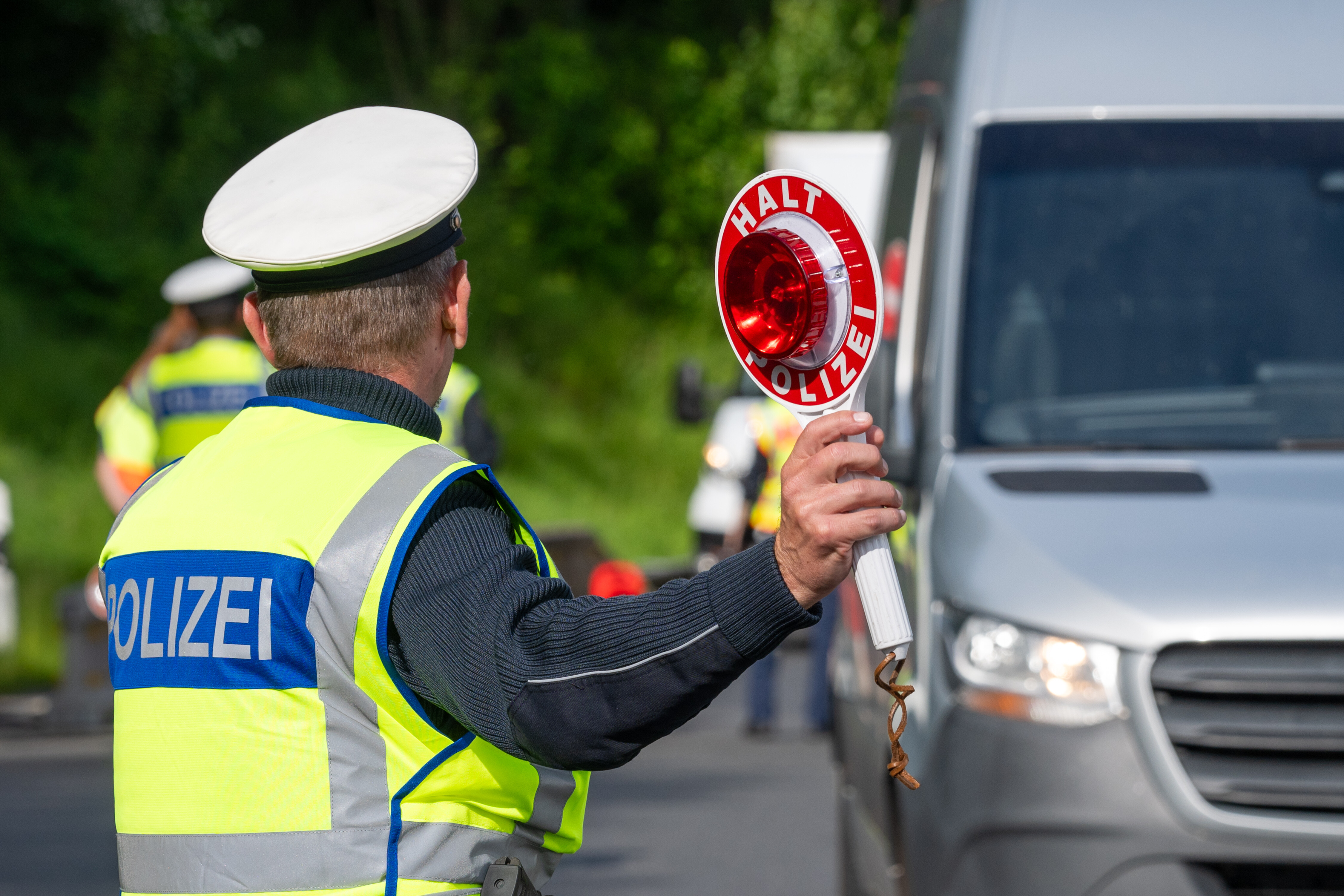 Ein Polizist winkt einen grauen Transporter zu einer Verkehrskontrolle raus.