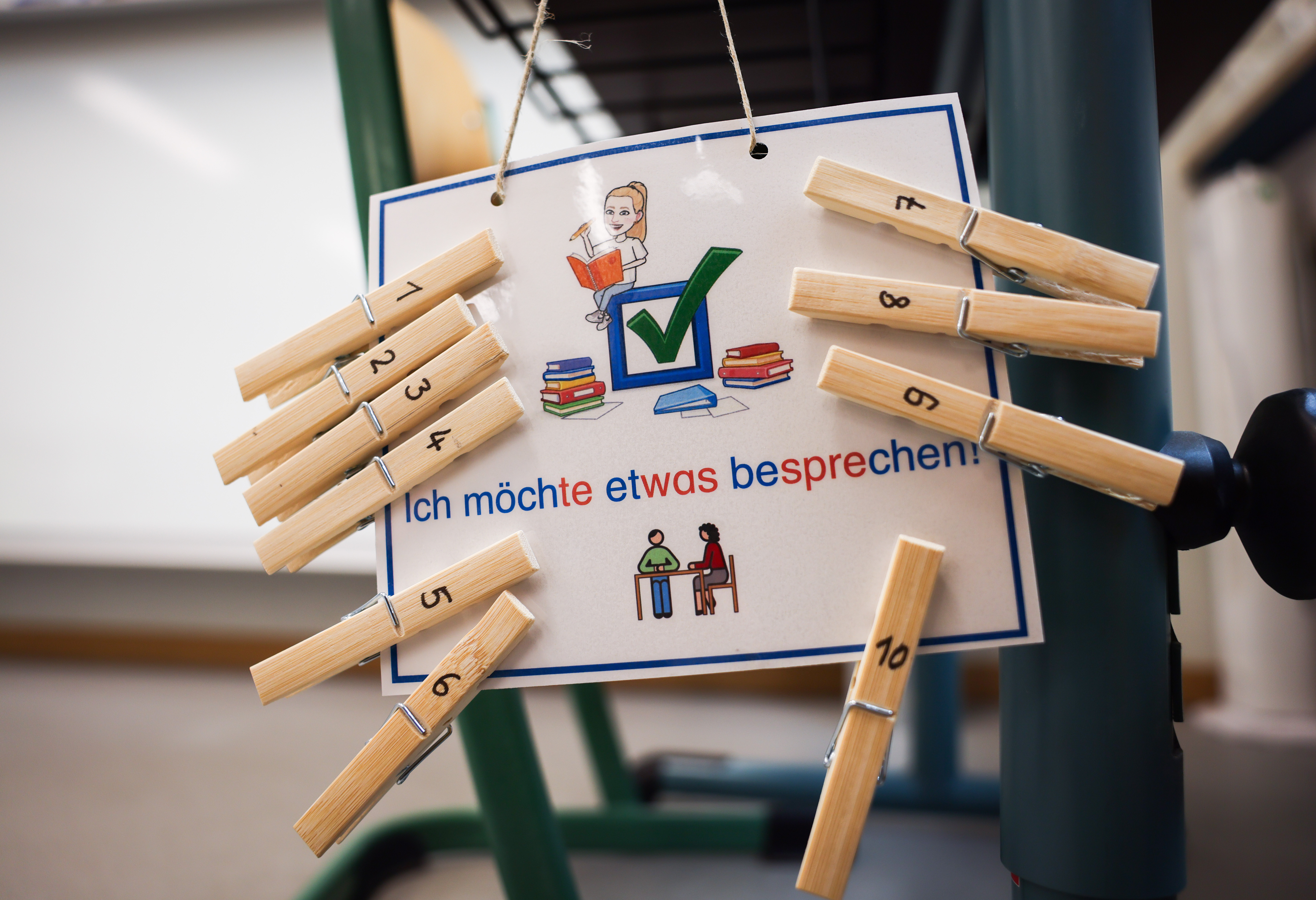 Im Klassenzimmer zeigt ein Schild mit nummerierten Wäscheklammern den Wunsch eines Kindes, etwas zu besprechen, z.B. für Beteiligung und Kommunikation im Schulalltag.
