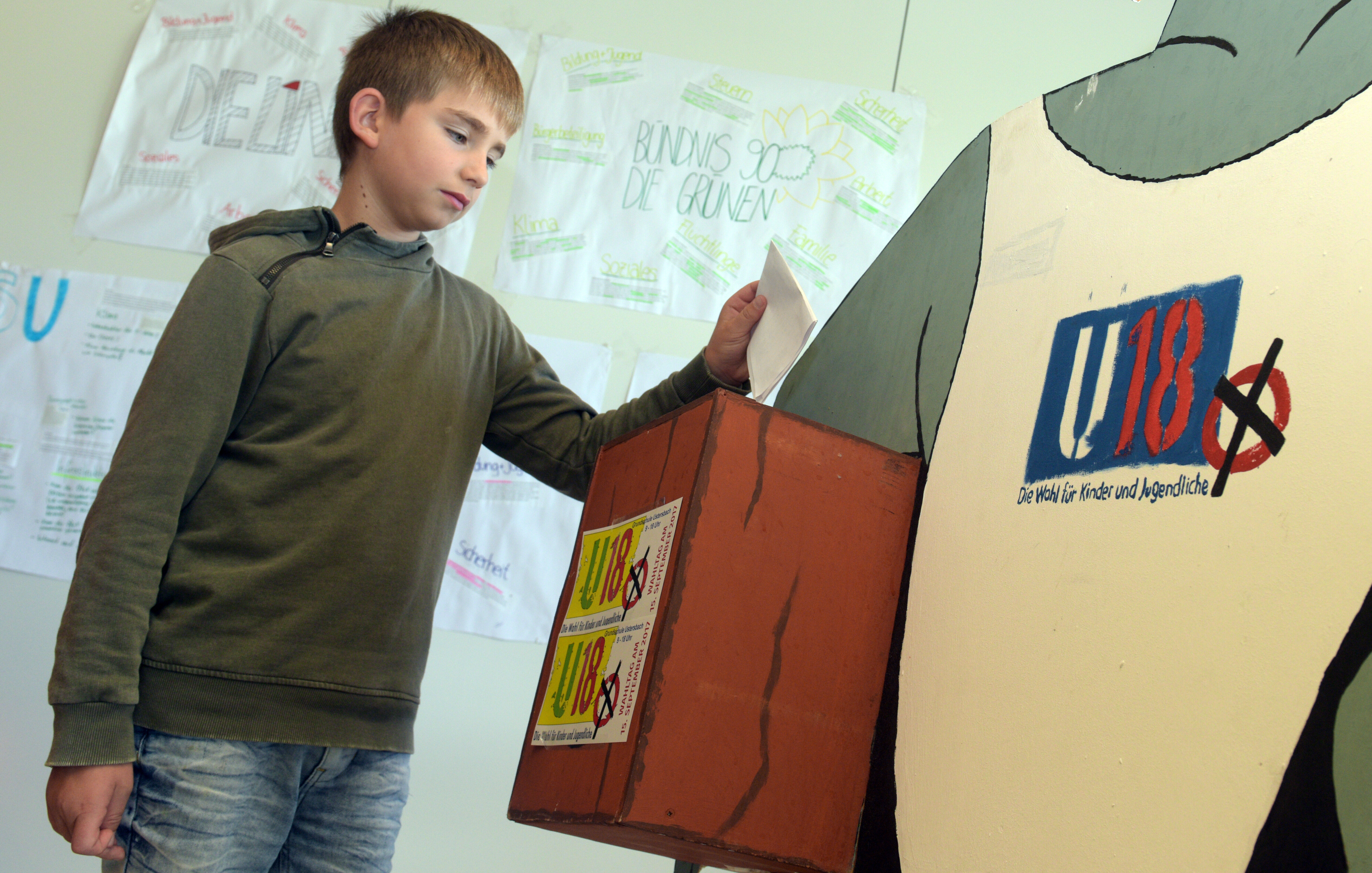 Ein Junge wirft bei der U18-Wahl seinen Stimmzettel in eine Wahlurne und nimmt so an der Jugendwahl teil, die politisches Interesse bei Kindern und Jugendlichen fördern soll.